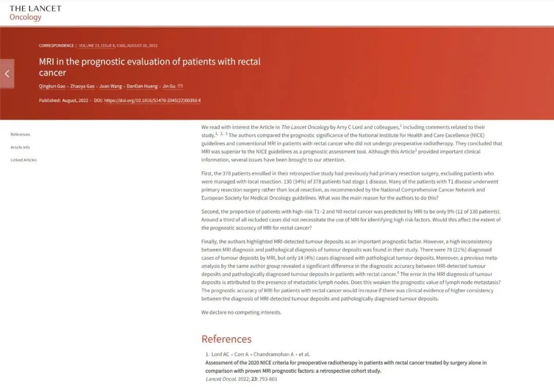 2022年5月,英国Amy Lord教授在《柳叶刀肿瘤学》发表一篇探索对比2020 NICE(英国大肠癌诊疗指南)标准与已被证实的MRI(核磁共振)风险因素进行直肠癌术前放疗评估的回顾性研究,结果显示,对比NICE指南标准,通过CRM(环周切缘)、EMVI(壁外血管侵犯)和肿瘤沉积等MRI预后因素对高危患者进行筛选或许是更好的选择。研究结果发表于Lancet Oncology(2020 IF:54.433)。顾晋教授带领胃肠肿瘤MDT团队在认真研读文章后,经过多次研讨,对该回顾性研究在术式、MRI评估、病理性肿瘤沉积的诊断三个层面提出问题与作者进行了讨论。7月27日,开云(中国)胃肠肿瘤MDT团队的评论意见被《The Lancet Oncology(柳叶刀肿瘤学)》接受并在线发表。文章的题目是“《MRI in the prognostic evaluation of patients with rectal cancer》(客观评判核磁对直肠癌患者预后评估的意义)”。